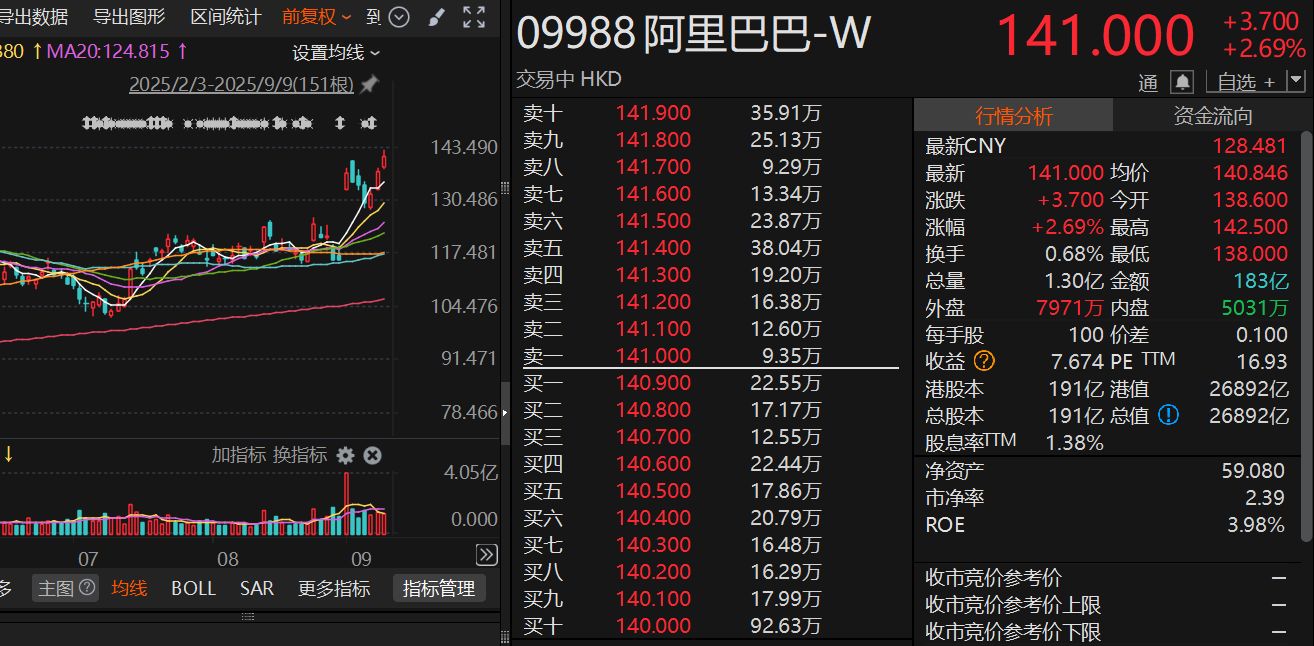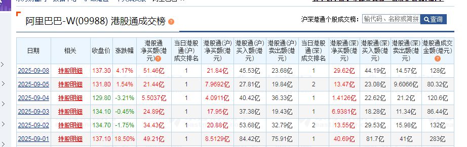 统计数据显示,2025年9月1日~8日期间,内地投资者通过港股通对阿里巴巴持续保持大额净买入,连续六个交易日“港股通净买入额”位居所有标的个股之首。即使9月2日至9月4日阿里巴巴股价出现下跌,也不改南向资金流入热情。短短六个交易日,港股通净买入金额已达到186.93亿港元。