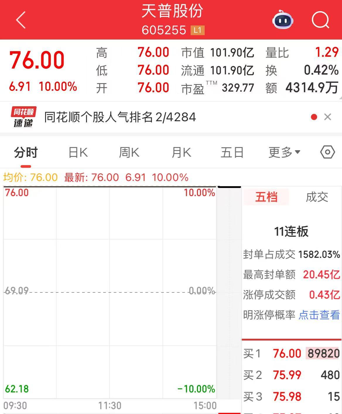 盘面上,截至今日收盘,天普股份再度涨停,收获11连板,最新报76元/股,市值101.90亿元。