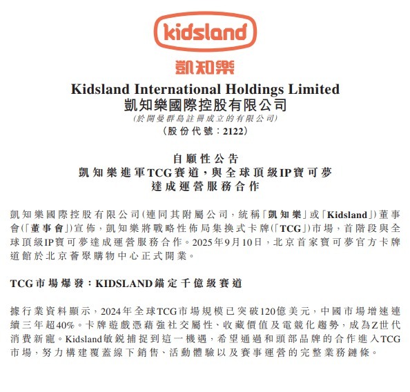 昨日(9月10日),该公司发布了一则公告,称凯知乐国际将战略性布局集换式卡牌(TCG)市场,首阶段与“宝可梦”IP达成运营服务合作。而就在昨日,北京首家宝可梦官方卡牌道馆正式开业。