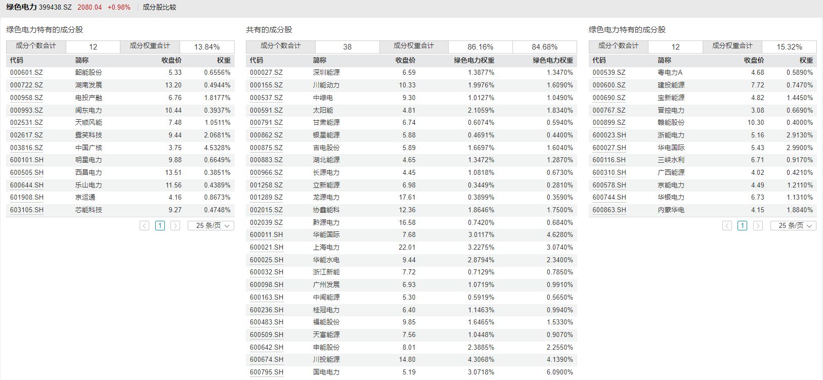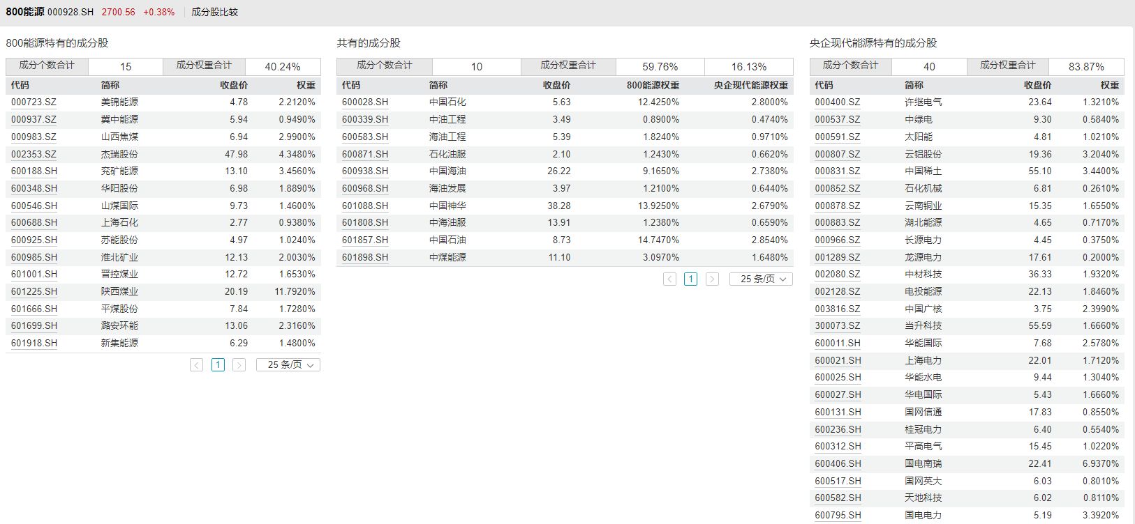 进一步对比两个指数的成分股可以发现,共同的成分股只有10只,中证能源指数独有的成分股是15只,中证国新央企现代能源指数独有的成分股是40只。