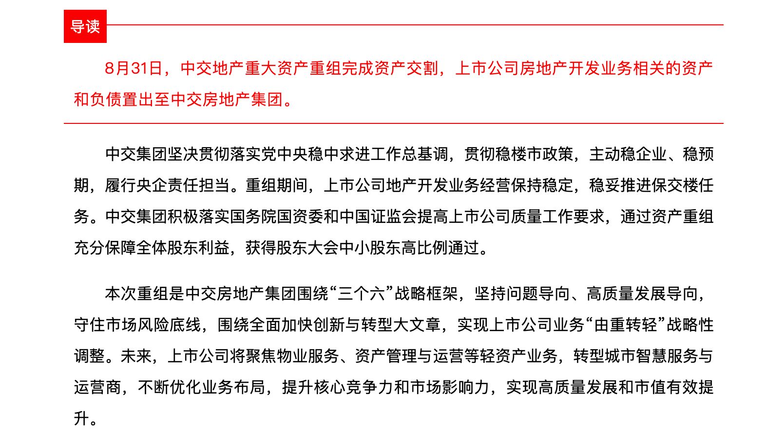 9月1日,“中国交建”微信公众号官宣:中交地产重大资产重组完成资产交割,上市公司房地产开发业务相关的资产和负债置出至中交房地产集团(即上文所述地产集团);实现上市公司业务“由重转轻”战略性调整,未来将聚焦物业服务、资产管理与运营等轻资产业务,转型城市智慧服务与运营商。
