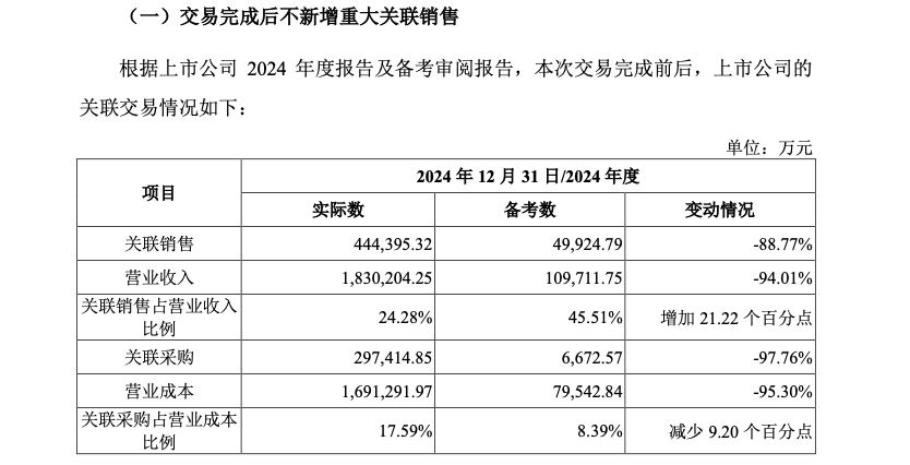 而从中交地产此前给深交所关于这次重大资产重组的问询函回复看,交易完成后,中交地产2024年度关联销售金额将由44.44亿元下降至4.99亿元,但占营业收入的比例将由24.28%上升至45.51%;关联采购金额将由29.74亿元下降至0.67亿元,占营业成本的比例将由17.59%下降至8.39%。
