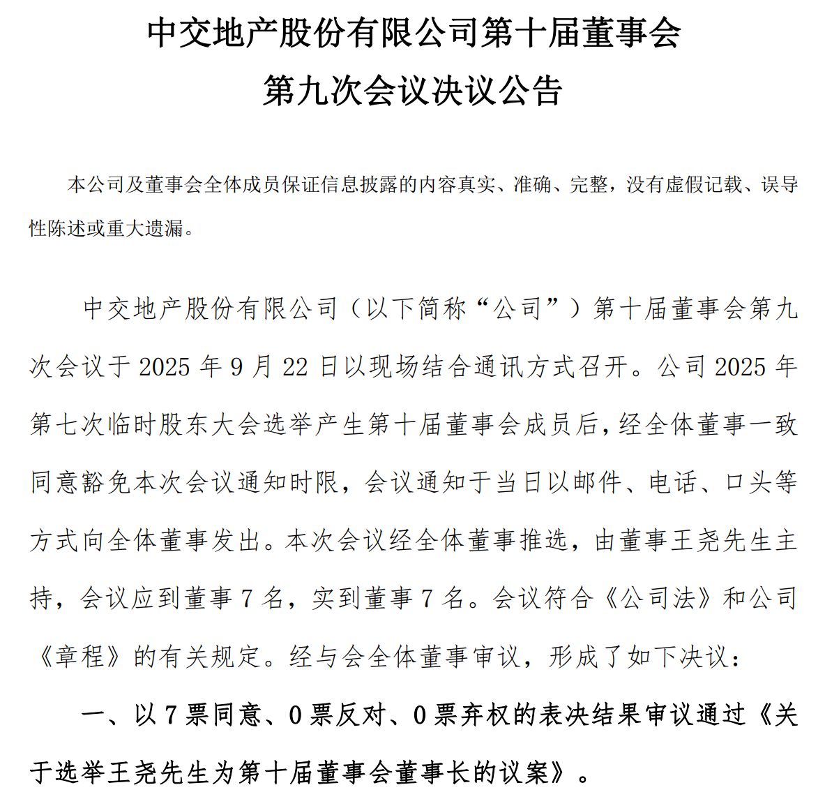 9月22日晚,中交地产(即*ST中地,000736.SZ,股价4.73元,市值35.34亿元)公告称,经第十届董事会第九次会议审议通过,选举王尧为公司新任董事长。