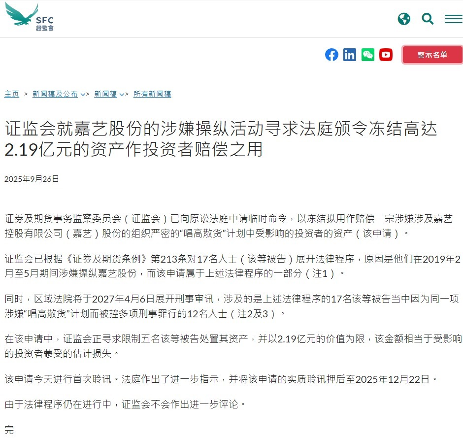 近日,香港证监会发布公告称,该机构已向原讼法庭申请临时命令,以冻结拟用作赔偿一宗涉嫌涉及嘉艺控股(01025.HK)的“唱高散货”计划中受影响的投资者的资产。香港证监会正寻求限制五名人士(被告)处置其资产,并以2.19亿港元的价值为限,该金额相当于受影响的投资者蒙受的估计损失。