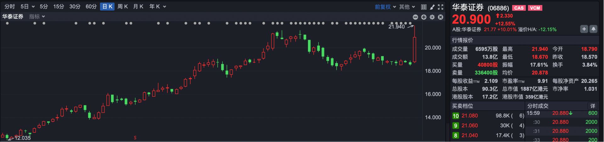焦点板块方面,中资券商股全线爆发。其中,华泰证券(06886.HK)、广发证券(01776.HK)、申万宏源香港(00218.HK)涨超12%,中信证券(06030.HK)、东方证券(03958.HK)涨超11%,中州证券(01375.HK)、中国银河(06881.HK)、中金公司(03908.HK)涨超9%。