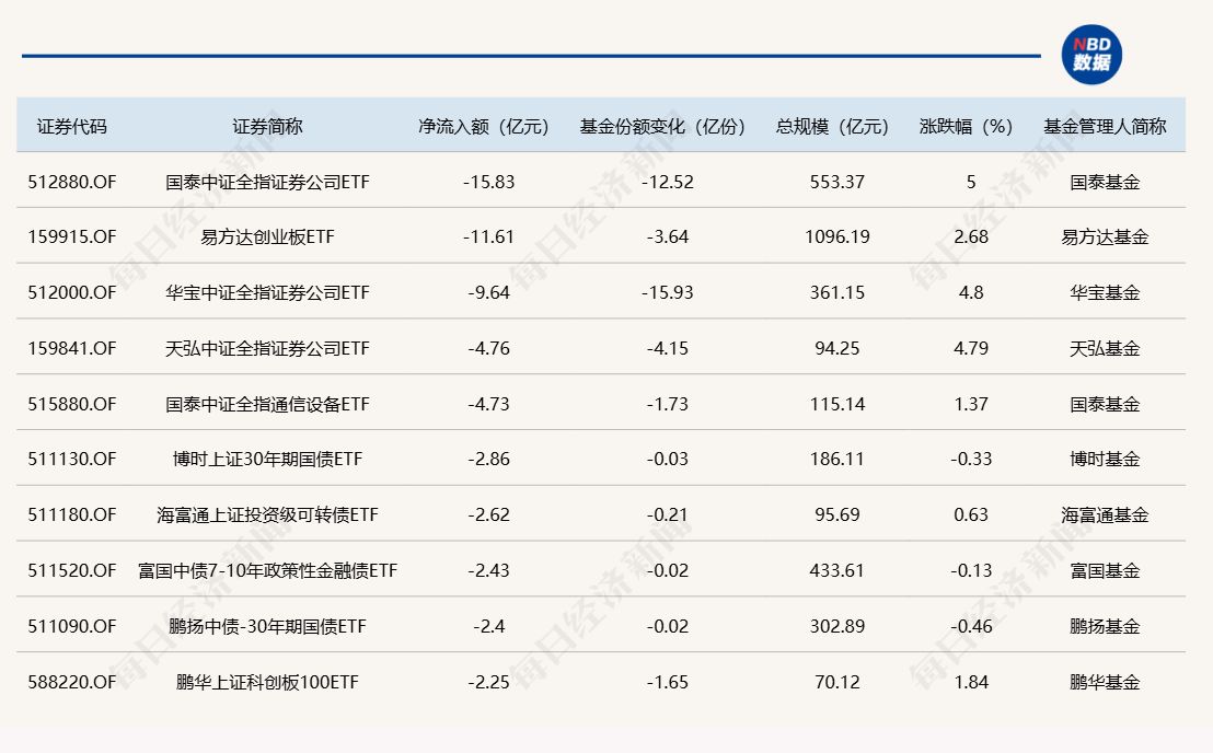 与此同时,国泰中证全指证券公司ETF基金份额减少12.52亿份,净流出额为15.83亿元;易方达创业板ETF基金份额减少3.64亿份,净流出额为11.61亿元;华宝中证全指证券公司ETF基金份额减少15.93亿份,净流出额为9.64亿元。