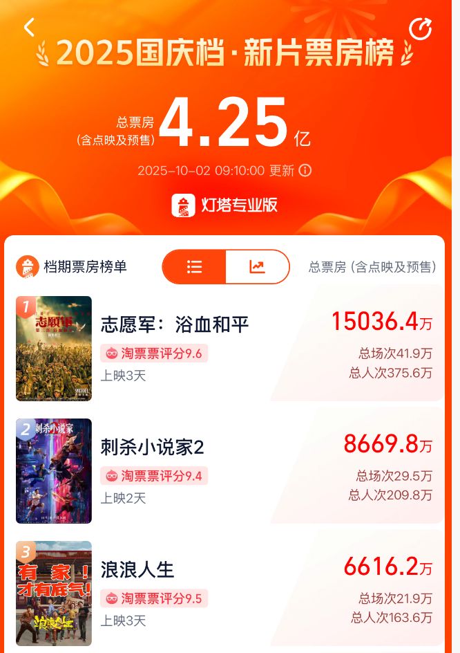 据灯塔专业版数据,截至10月2日上午9时,2025年国庆档票房达4.25亿元,《志愿军:浴血和平》《刺杀小说家2》《浪浪人生》暂列票房前三。