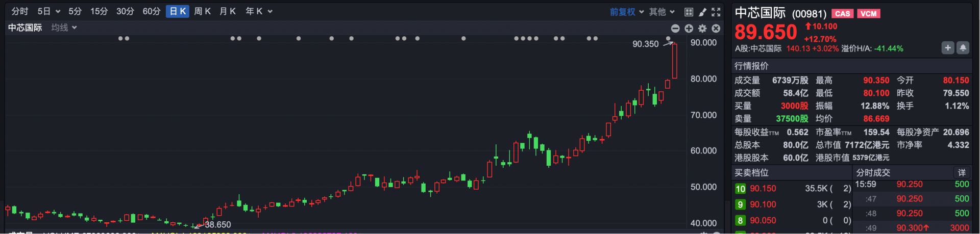 焦点板块,半导体板块全线上行。其中,中芯国际(00981.HK)大涨12%,再创历史新高。此外,长飞光纤光缆(06869.HK)涨超10%,宏光半导体(06908.HK)、华虹半导体(01347.HK)涨超7%,上海复旦(01385.HK)涨超4%。