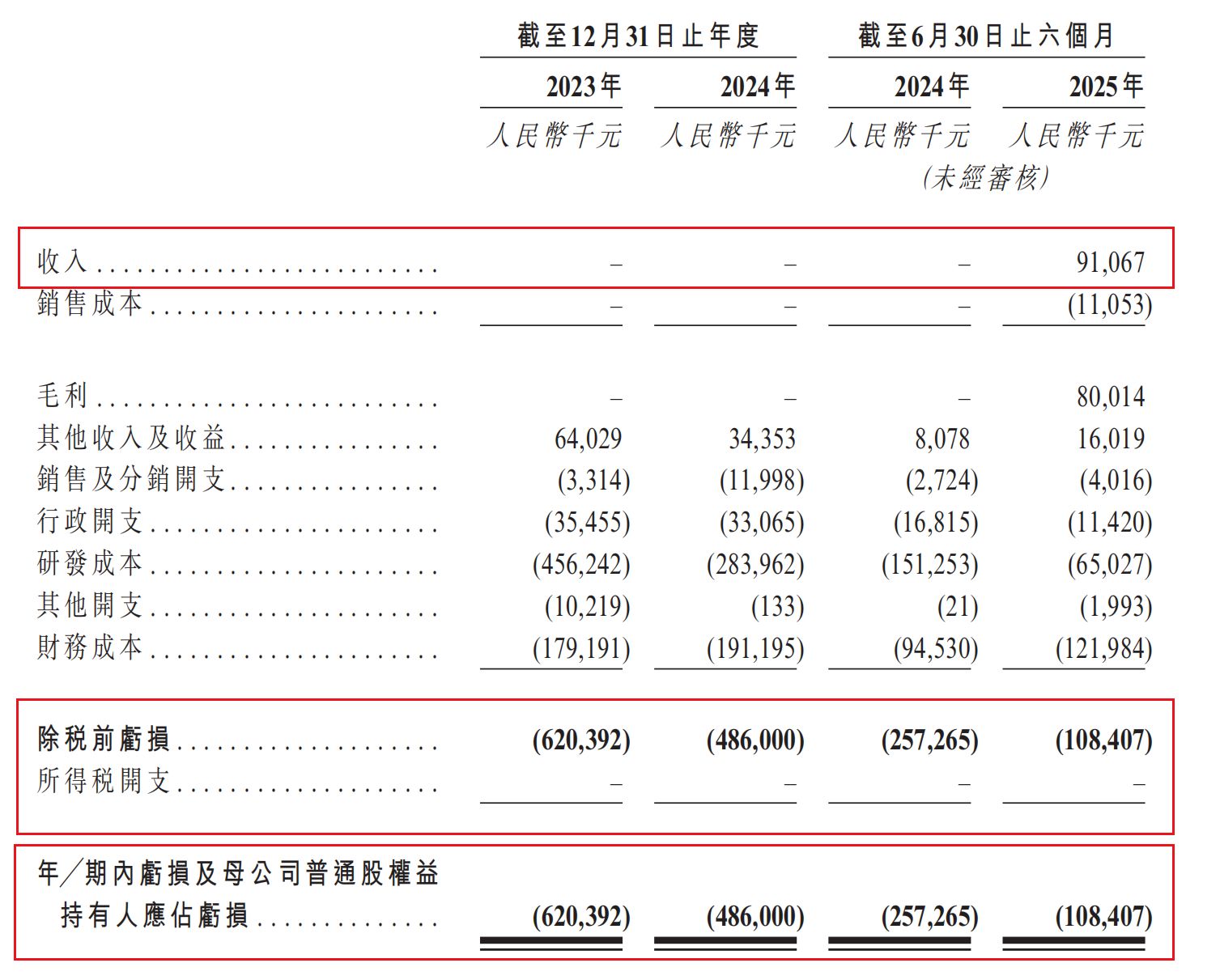 招股书中,先为达生物的财务压力一览无余。在2023年和2024年两个完整财年,公司的营业收入均为零,直至2025年上半年才首次实现0.91亿元的营收,主要来自对外授权合作和研发服务收入。然而,随着持续的研发投入,公司的亏损额也在不断扩大。