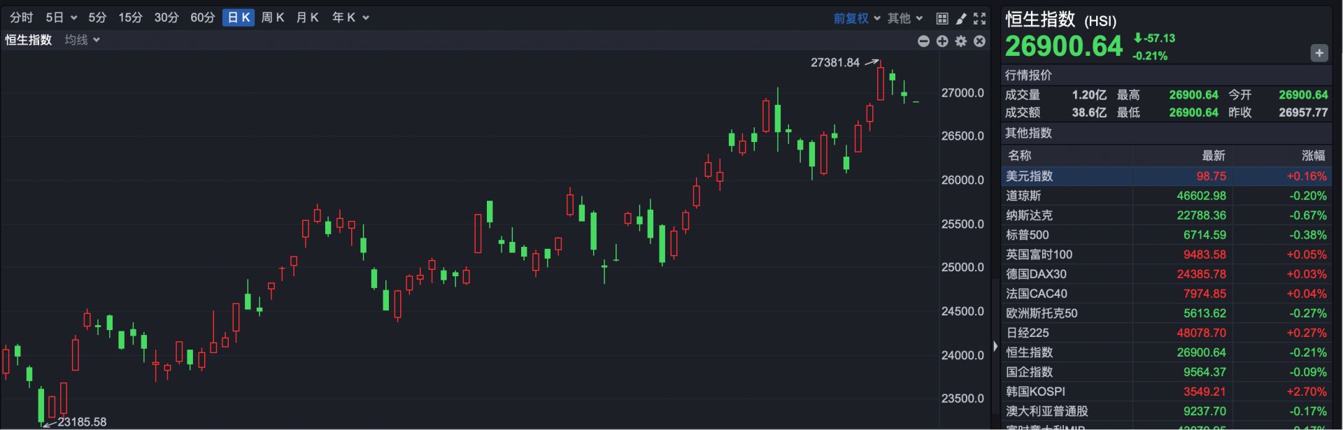 截至发稿,恒生指数报26900点,下跌57点,跌幅0.21%。