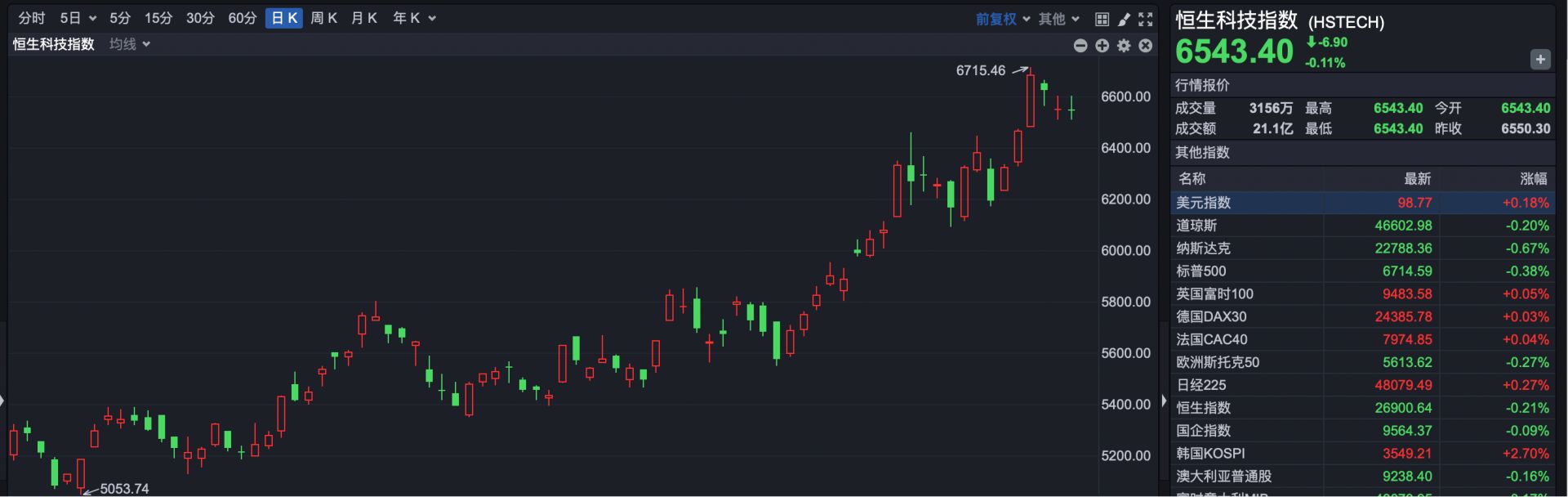 恒生科技指数报6543点,下跌6.90点,跌幅0.11%。