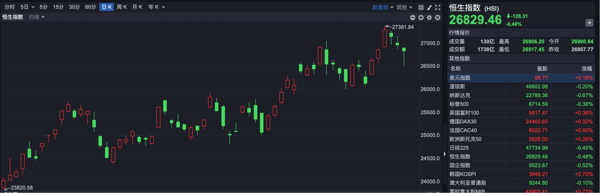 截至收盘,恒生指数报收于26829.46点,下跌128.31点,跌幅0.48%,全天成交1652亿港元,较昨日有所放量。