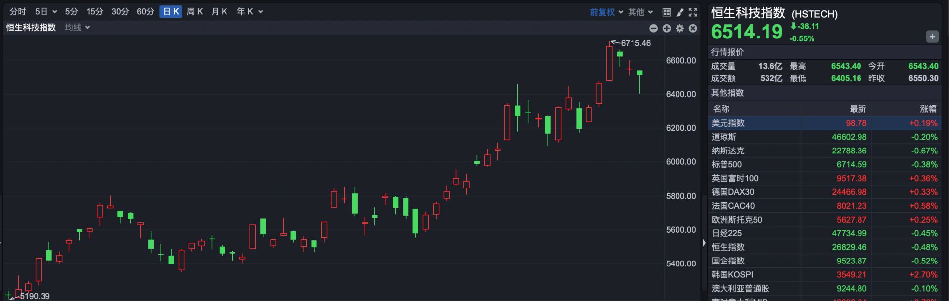 恒生科技指数报收于6514.19点,下跌36.11点,跌幅0.55%。