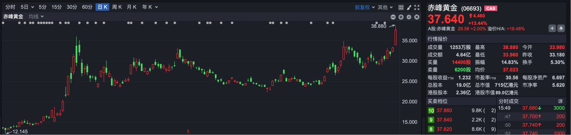 焦点板块,黄金股继续成为全天热点。板块中,赤峰黄金(06693.HK)涨超13%,创历史新高;中国白银集团(00815.HK)涨超12%,山东黄金(01787.HK)涨超7%,招金矿业(01818.HK)涨超4%,灵宝黄金(03330.HK)、潼关黄金(00340.HK)跟涨。此外,紫金矿业(02899.HK)小涨0.29%,紫金黄金国际(02259.HK)逆势回落0.48%。