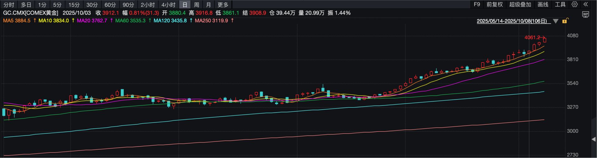 消息面,COMEX黄金价格涨超1.3%,最高报4061.2美元/盎司,再创历史新高。高盛在近期发布的报告中提到,近期金价上涨主要反映了三大“坚定买方”加大购买黄金:快速增长的西方ETF仓位、各国央行可能重新加速购买,以及投机仓位的提升。尤其是西方黄金ETF的配置在9月份意外强劲。基于各国央行预计将持续增持黄金,以及个人投资者对黄金的大力买入,10月7日高盛将2026年12月黄金价格预期从每盎司4300美元上调至每盎司4900美元。