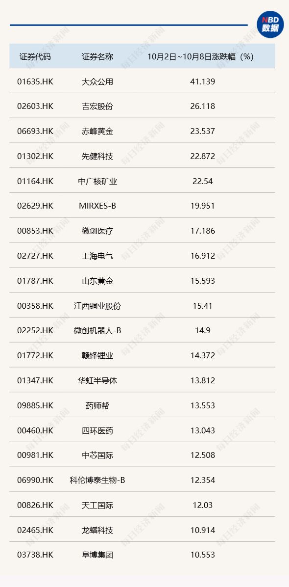 港股通标的10月2日~10月8日累计涨幅TOP20
