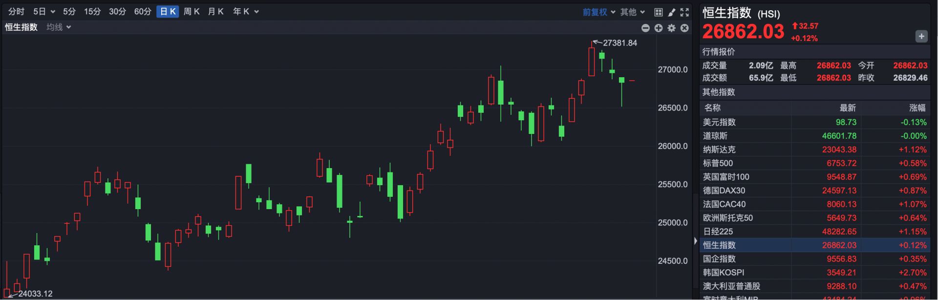 截至发稿,恒生指数报26862点,上涨32点,涨幅0.12%。