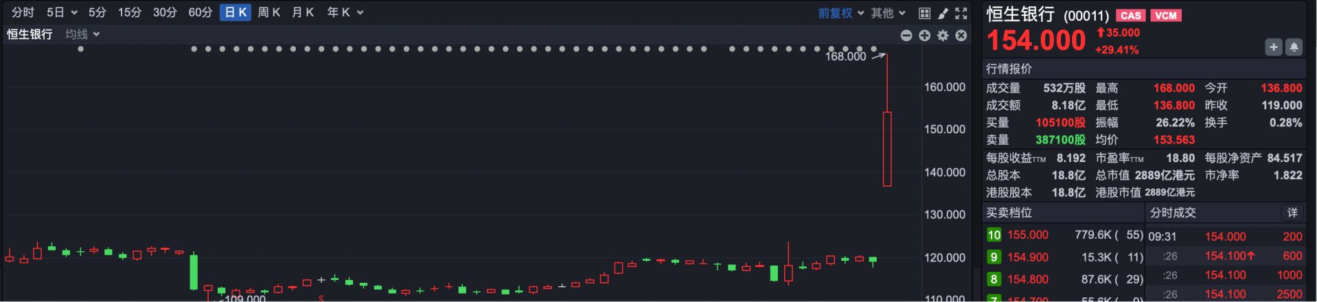 今日开盘后,恒生银行股价瞬间飙升至168港元,最大涨幅高达41%。截至发稿,恒生银行报154.1港元,涨幅29.5%,最高市值已超2800亿港元。