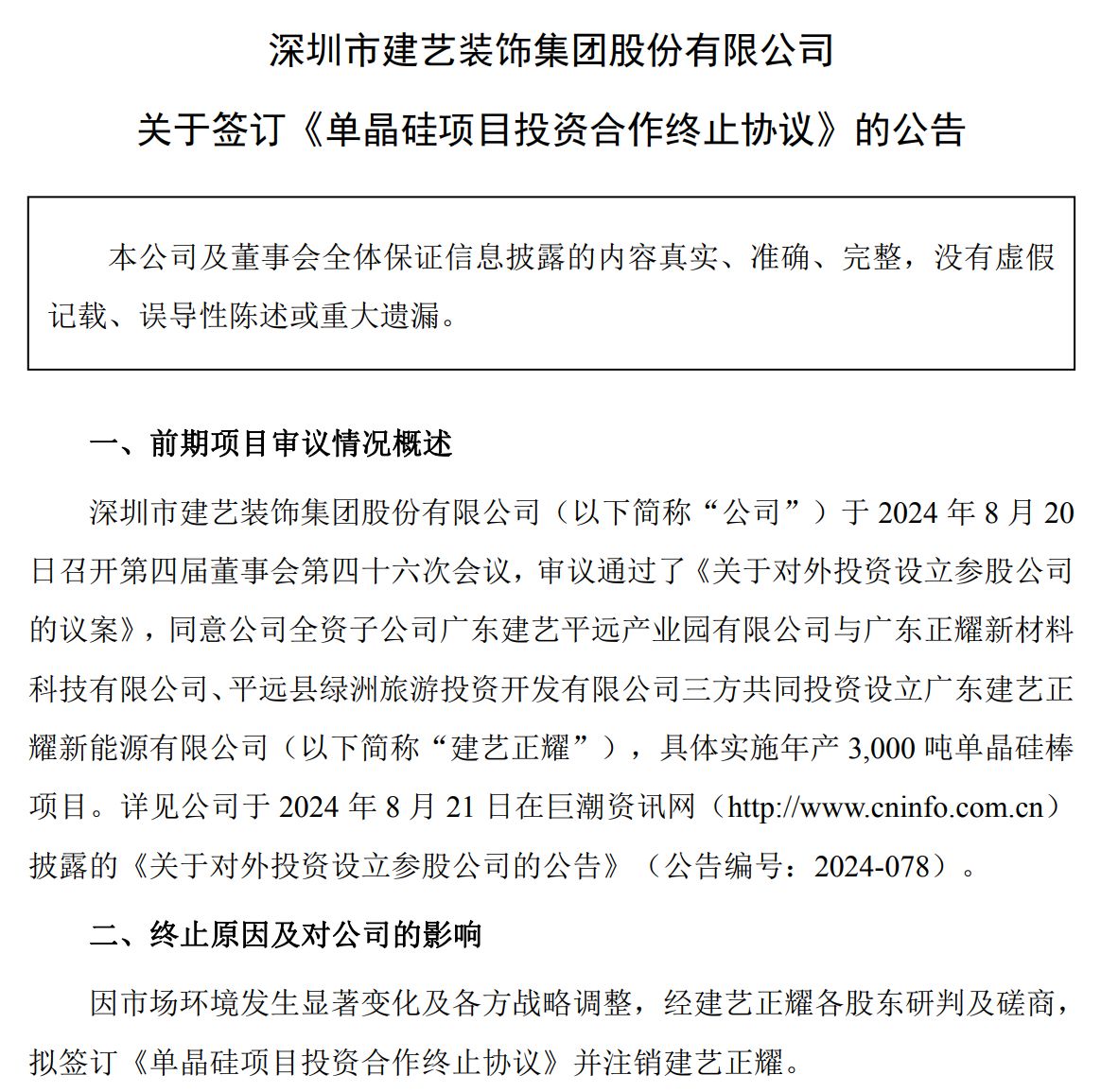 根据*ST建艺10月8日公告,公司决定签订《单晶硅项目投资合作终止协议》,并注销用于实施该项目的参股公司建艺正耀。公告将终止原因归结为“市场环境发生显著变化及各方战略调整,经建艺正耀各股东研判及磋商”。