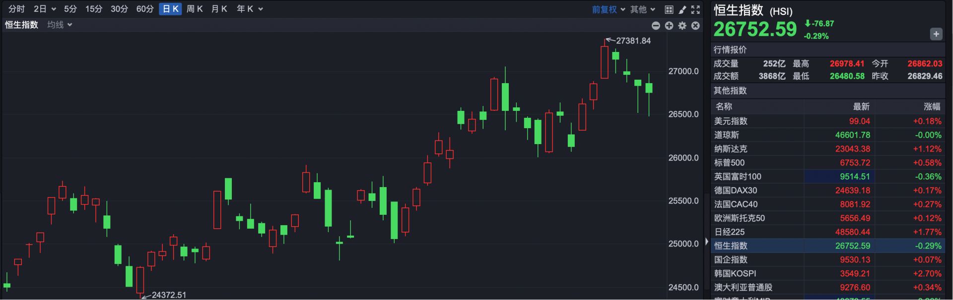 截至收盘,恒生指数报收于26752.59点,下跌76.87点,跌幅0.29%。