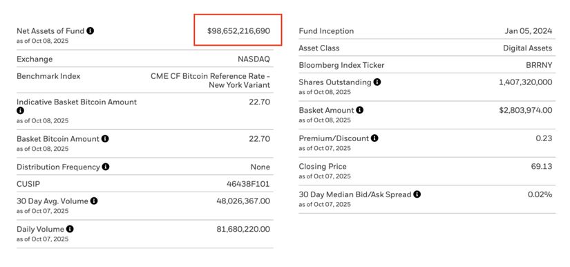 贝莱德官网数据显示,截至10月8日,该公司旗下的现货比特币ETF产品IBIT最新规模已达到986.52亿美元。