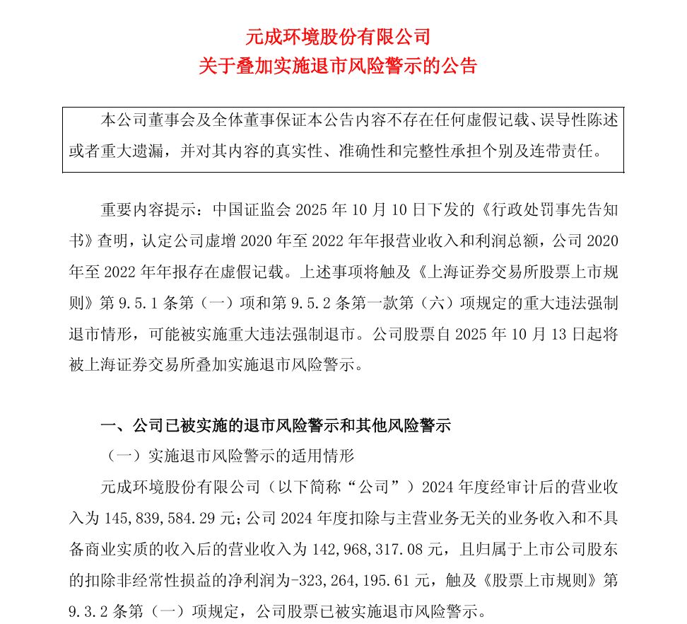 *ST元成10月10日晚间公告,公司因涉嫌年报等定期报告财务数据虚假披露被中国证监会立案调查,收到浙江证监局下发的《行政处罚事先告知书》,认定公司2020年至2022年年报存在虚假记载,具体包括:通过虚增越龙山项目成本和产值虚增收入及利润;未及时将淮阴项目价审差异入账处理虚增2022年利润;2022年非公开发行股票文件存在重大虚假记载。如根据正式处罚决定书结论,公司触及重大违法强制退市情形,股票将被终止上市。根据相关规定,若后续收到处罚决定书,公司将申请停牌,交易所将在规定期限内作出是否终止上市决定。