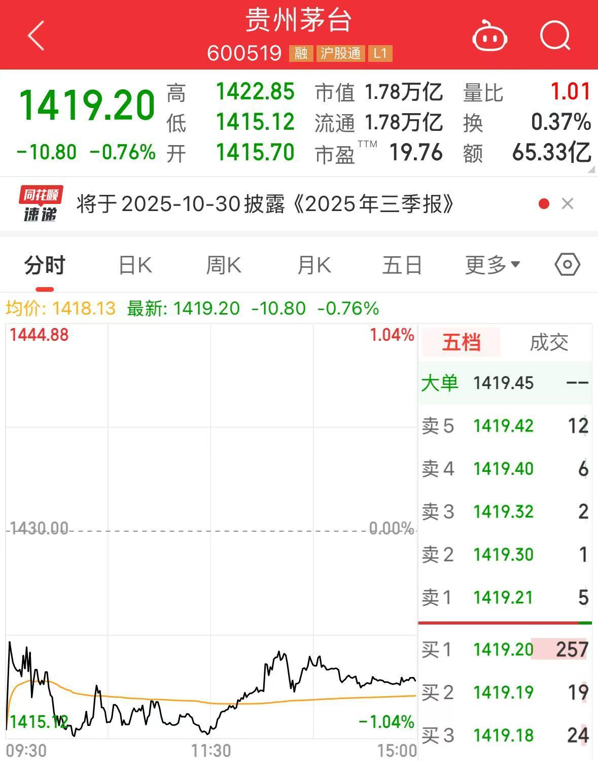 截至A股今日收盘,贵州茅台股价下跌0.76%,报1419.2元/股。