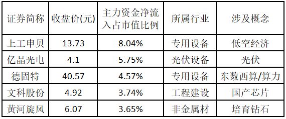 主力资金净流入金额占市值比例排名前5的个股分别为上工申贝、亿晶光电、德固特、文科股份、黄河旋风。欢迎大家关注微信公众号“道达号”,其“道达涨停复盘”栏目为大家解读。