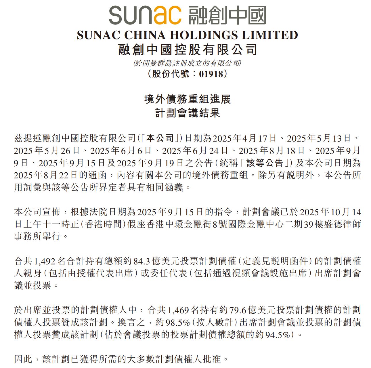 鉴于本次表决结果远超75%金额门槛,已满足法院批准的核心要求,方案随之将迎来法院批准流程。公告明确,香港高等法院将于11月5日举行聆讯,对其重组方案作出最终裁决。这意味着,融创境外债重组方案距离彻底完成仅有一步之遥。