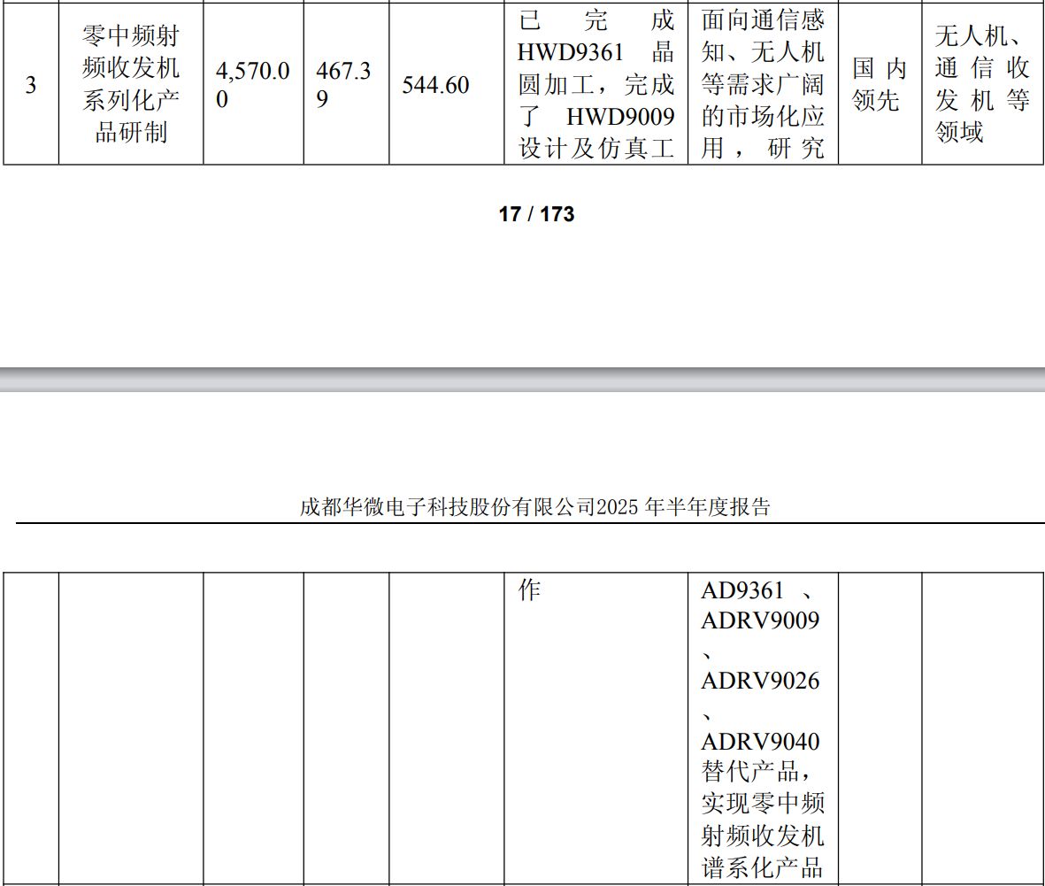 每经记者梳理发现,其实在2025年半年报中,成都华微就已经对该芯片进行了披露。具体来看,该“零中频射频收发机系列化产品研制”在研项目的预计总投资规模为4570万元,2025年上半年投入金额为467.39万元,截至2025年上半年末已累计投入544.6万元。具体应用前景为“无人机、通信收发机等领域”。