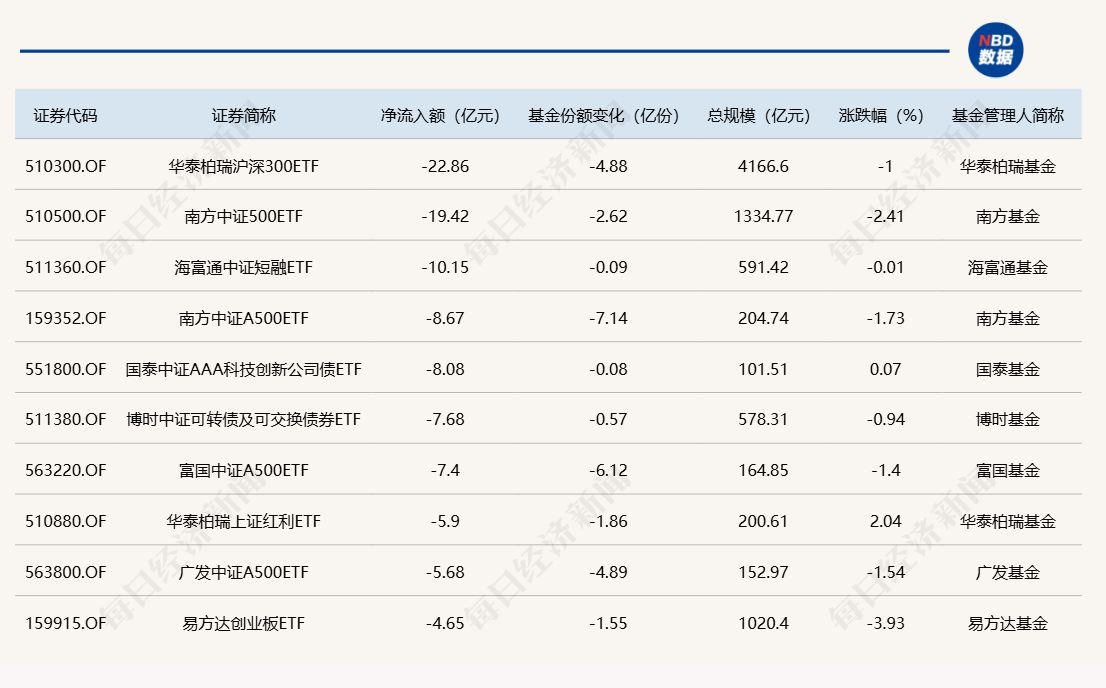 与此同时,华泰柏瑞沪深300ETF基金份额减少4.88亿份,净流出额为22.86亿元;南方中证500ETF基金份额减少2.62亿份,净流出额为19.42亿元;海富通中证短融ETF基金份额减少0.09亿份,净流出额为10.15亿元。
