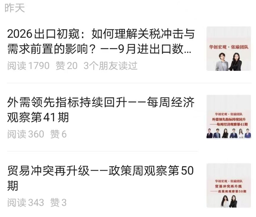 值得一提的是,昨日深夜,张瑜的微信公众号一连发了三篇文章,均为其团队最近发布的研究报告。其中,头条文章解读了最近发布的进出口数据。《2026出口初窥:如何理解关税冲击与需求前置的影响?——9月进出口数据点评》一文指出,“在8月7日新版对等关税生效以后,9月中国出口大超预期,虽然客观有低基数(9月出口环比与历史同期均值基本持平,两年平均同比5.3%低8月6.5%)和工作日天数增加等因素的影响,但与此同时中国PMI新出口订单指数于9月升至近五年同期最高,也彰显了出口韧性。”