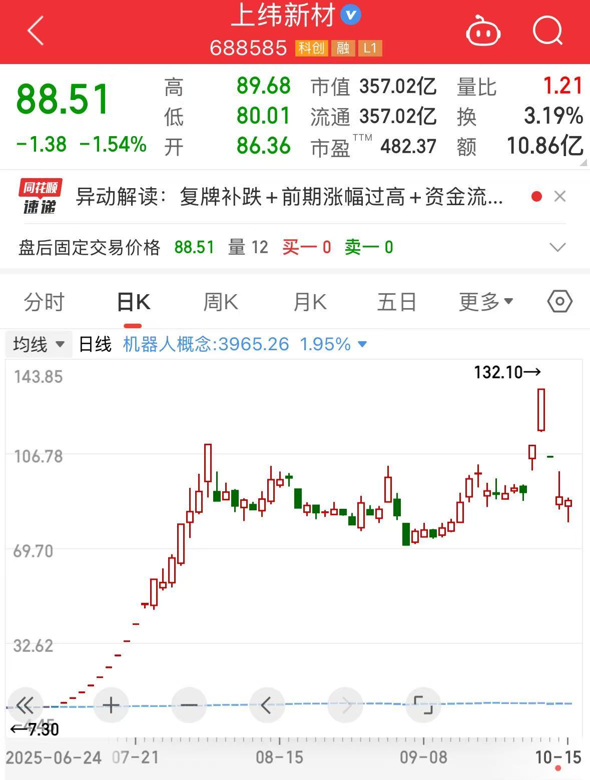 然而,值得注意的是,自10月13日复牌以来,上纬新材股价已经连续3个交易日下跌,13日复牌当天更是跌了20%。