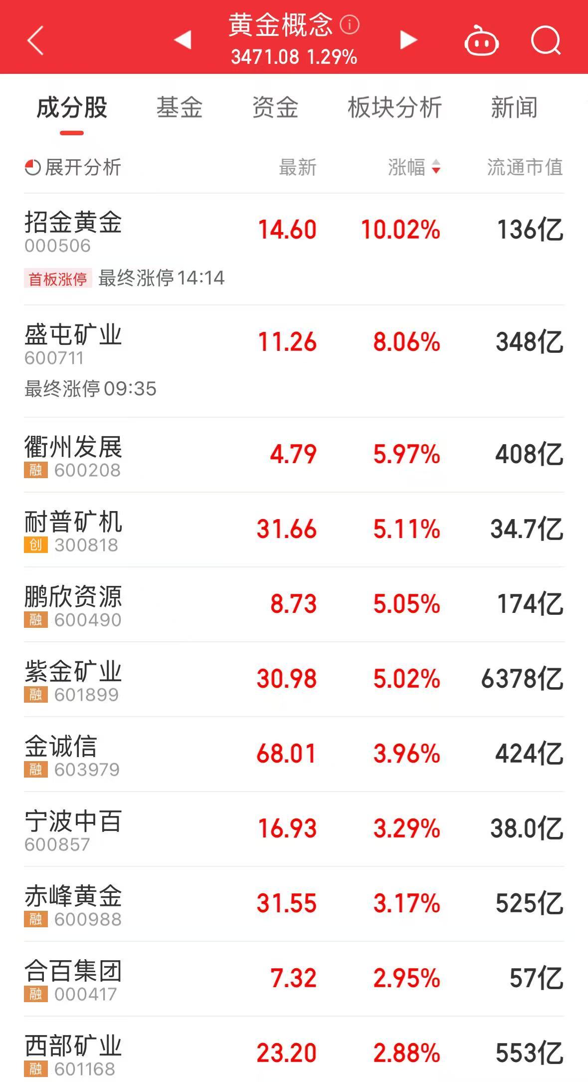 盘面上,10月15日,黄金概念午后探底回升,招金黄金涨停,此前盛屯矿业触及涨停,紫金矿业、鹏欣资源、赤峰黄金、豫光金铅跟涨。