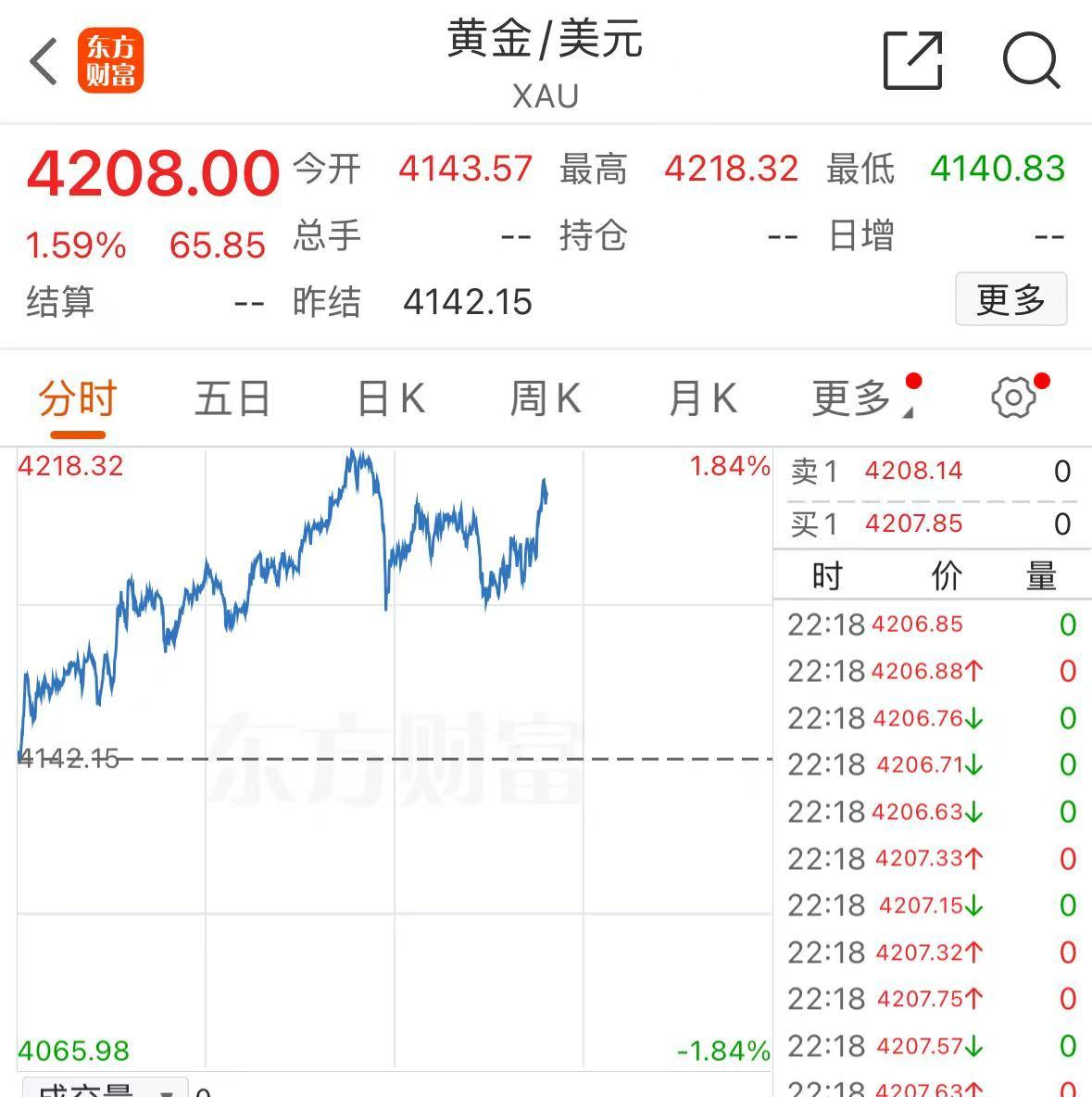 消息面上,现货黄金日内涨超1%,一度突破4210美元/盎司,续创历史新高。