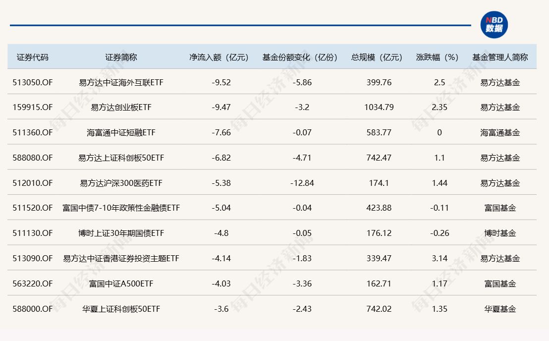 与此同时,易方达中证海外互联ETF基金份额减少5.86亿份,净流出额为9.52亿元;易方达创业板ETF基金份额减少3.2亿份,净流出额为9.47亿元;海富通中证短融ETF基金份额减少0.07亿份,净流出额为7.66亿元。