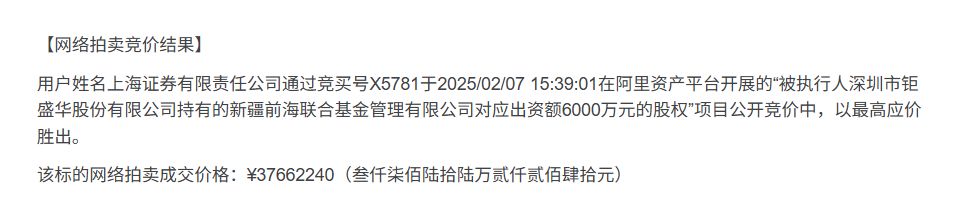 其中,深圳市钜盛华股份有限公司持有的这部分股权,此前曾多次出现在拍卖平台上。今年2月份,上海证券以3766万元的价格拍下该部分股权。