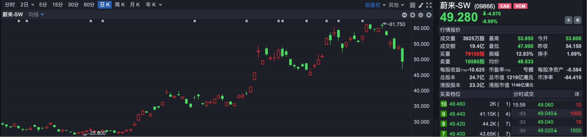 焦点公司方面,千亿市值新能源车企蔚来-SW(09866.HK)下午突发大跌,盘中最大跌幅超13%。截至收盘,蔚来跌近9%,股价报49.28港元。