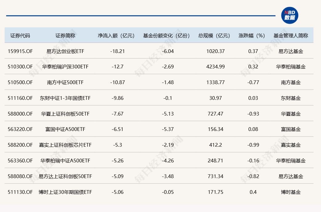 与此同时,易方达创业板ETF基金份额减少6.04亿份,净流出额为18.21亿元;华泰柏瑞沪深300ETF基金份额减少2.69亿份,净流出额为12.7亿元;南方中证500ETF基金份额减少1.48亿份,净流出额为10.87亿元。
