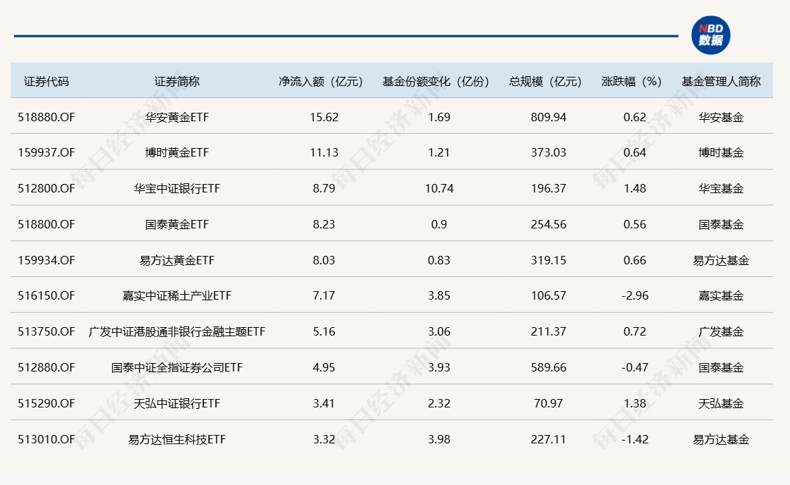 Wind数据显示,在10月16日非货币ETF市场中,华安黄金ETF基金份额增加1.69亿份,净流入额为15.62亿元;博时黄金ETF基金份额增加1.21亿份,净流入额为11.13亿元;华宝中证银行ETF基金份额增加10.74亿份,净流入额为8.79亿元。