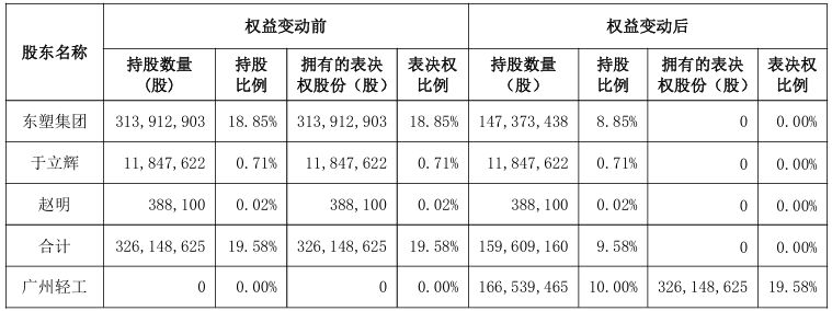 公告中披露的权益变动情况显示,交易完成后,东塑集团的持股比例将从18.85%降至8.85%,其一致行动人于立辉和赵明的持股比例维持不变,但三者合计持有的9.58%股份的表决权均将委托给广州轻工,自身不再拥有表决权。而广州轻工将直接持有公司10%的股份,并拥有合计19.58%的表决权。