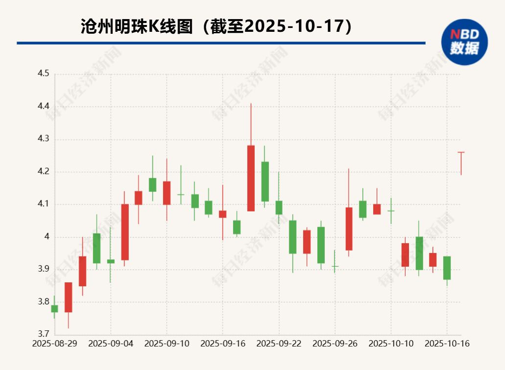 《每日经济新闻》记者注意到,10月17日早盘沧州明珠开盘即涨停,其后曾短暂打开过涨停,截至记者发稿时,股价仍维持在4.26元的涨停价。