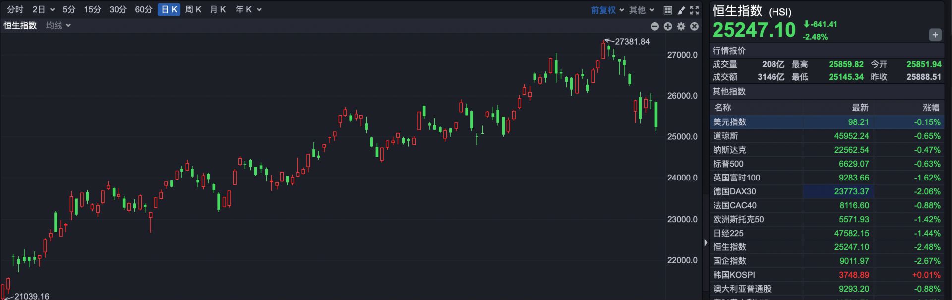 截至收盘,恒指报收于25247.10点,下跌641.41点,跌幅2.46%,创下9月5日以来的收盘新低。