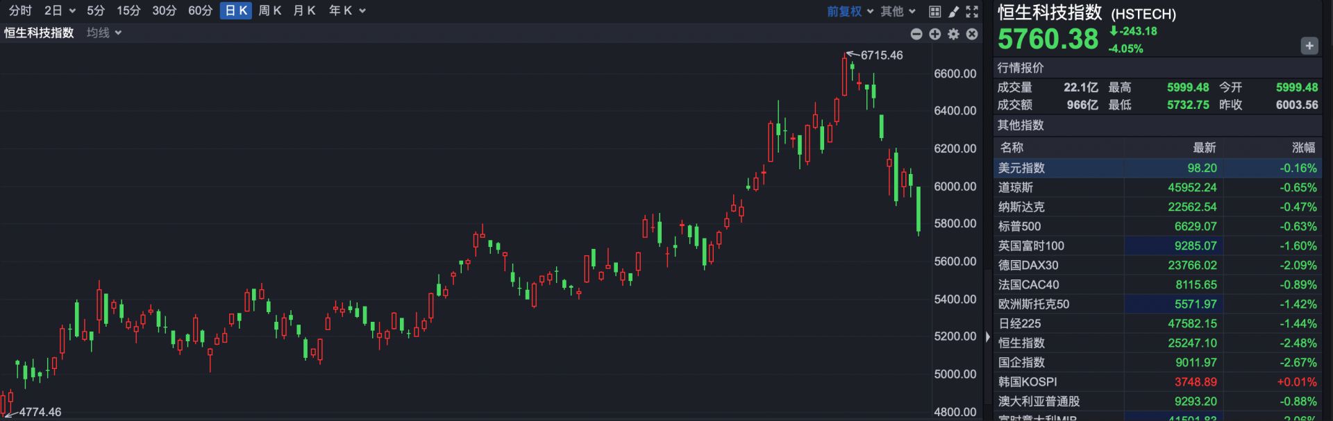 恒生科技指数报收于5760.38点,下跌243.18点,跌幅4.05%。自10月2日高点回落以来,恒生科技指数累计跌幅超14%。