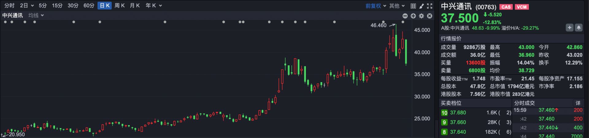 焦点公司方面,中兴通讯H股(00763.HK)跌超12%,盘中最大跌幅达14%,同时中兴通讯A股(000063.SZ)以跌停报收。