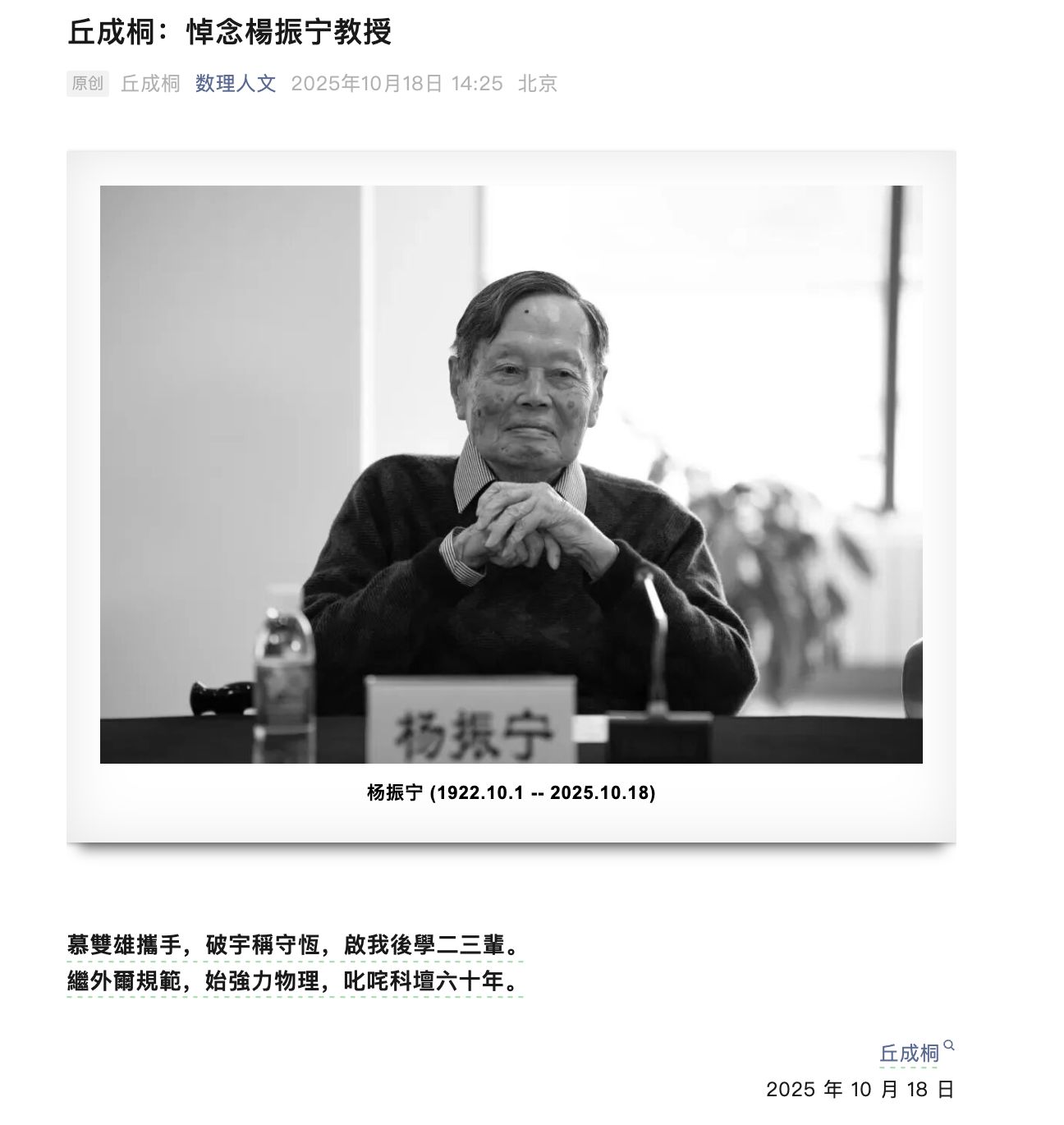 据新华社消息,享誉世界的物理学家、诺贝尔物理学奖获得者,中国科学院院士,清华大学教授、清华大学高等研究院名誉院长杨振宁先生,因病于2025年10月18日在北京逝世,享年103岁。