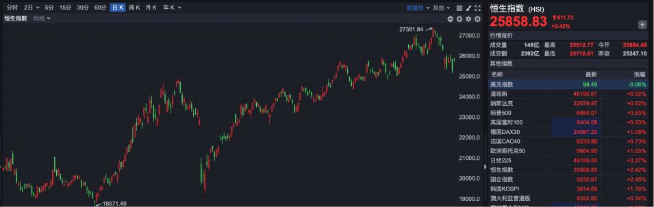 截至收盘,恒指报收于25858.83点,上涨611.73点,涨幅2.42%。