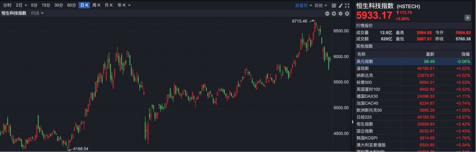 恒生科技指数报收于5933.17点,上涨172.79点,涨幅3%。