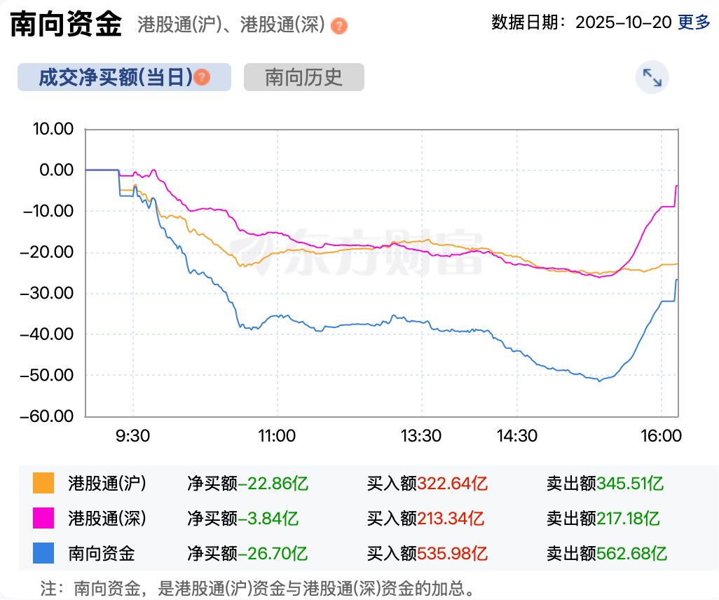 资金方面,尽管港股市场反弹,但南向资金却开始净卖出。今日盘中,南向资金一度净卖出超过50亿港元,但尾盘资金有所回流。截至收盘,南向资金净卖出港股金额超26亿港元。