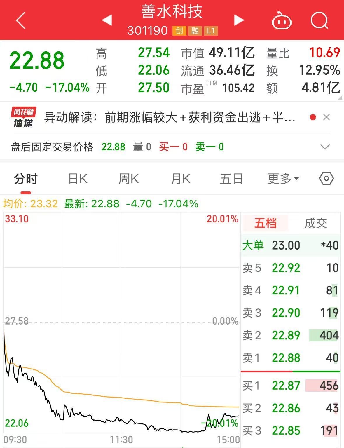 盘面上,善水科技今日大跌17.04%,股价报22.88元,市值49.11亿元。